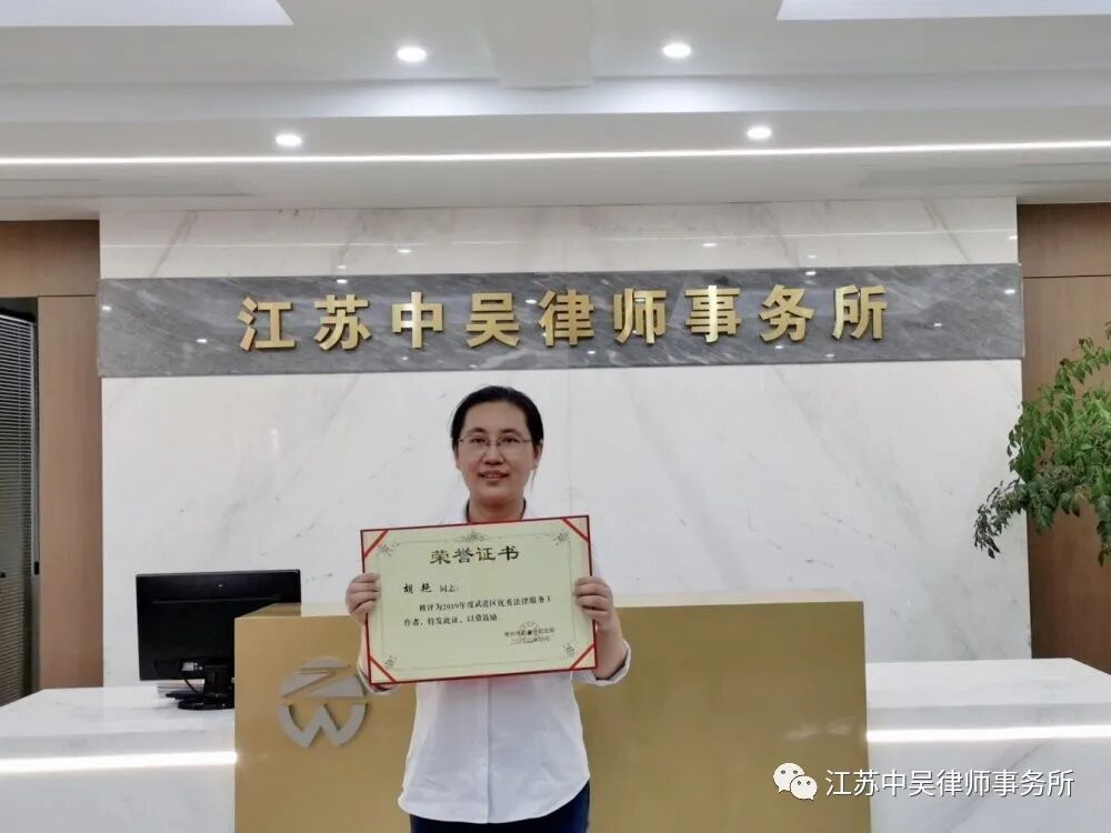 会议中,对武进区司法行政系统在“七五”普法中的优秀单位和个人做了表彰。江苏中吴律师事务所荣获2019年武进区优秀律师事务所的称号,并获颁牌匾;江苏中吴律师事务所胡艳律师荣获2019年武进区优秀法律服务工作者的称号。2020年江苏中吴律师事务所也将坚持维护当事人合法权益,为当事人提供专业高效的法律服务,并坚持主动承担社会责任,为推动社会治理体系和社会治理能力现代化贡献力量。